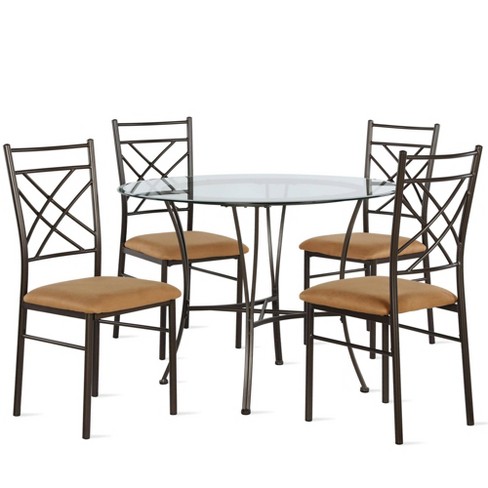 We complete each glass top dining room set with complementary chairs, offering seamless collections with exquisite modern, transitional or traditional looks. We have a variety of dining room table styles to choose from and our prices are always competitive. The swain round dining table has a circular clear tempered glass top to go along with the exposed chrome gold plated tubular metal base. Roundhill furniture cylina solid wood glass top round dining table with 4 chairs walmart usa. Whether you're searching for a farmhouse table that's large enough for your entire family or a glass top dining table to finalize your modern space, you'll be able to find exactly what you.